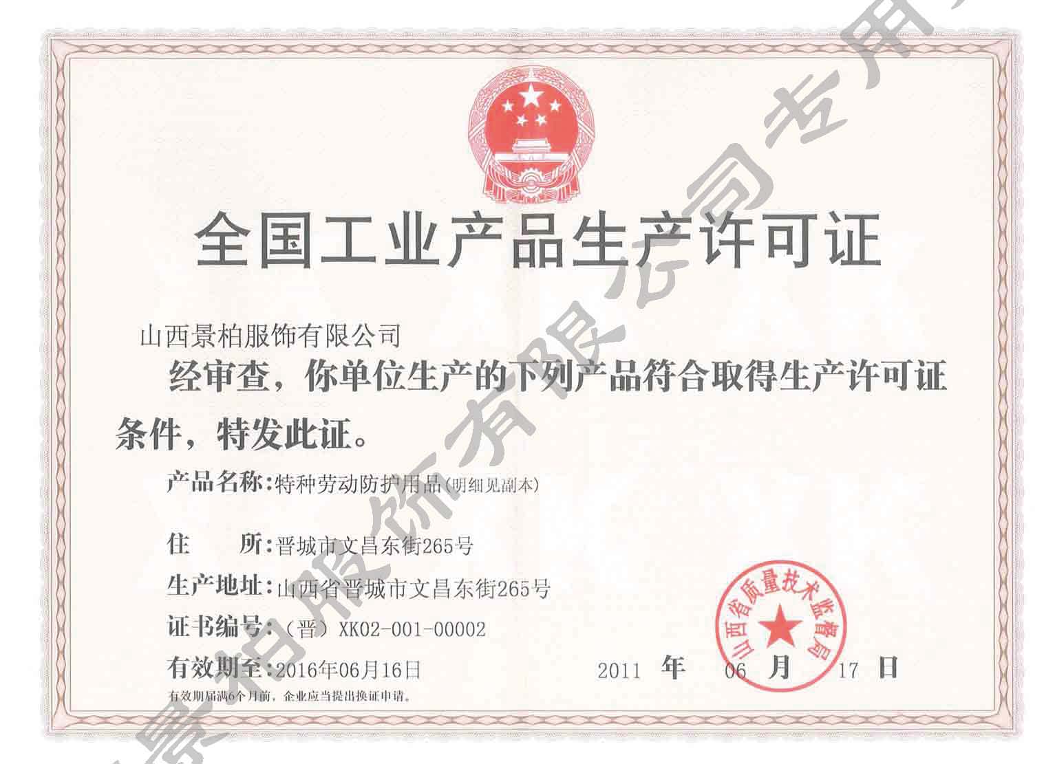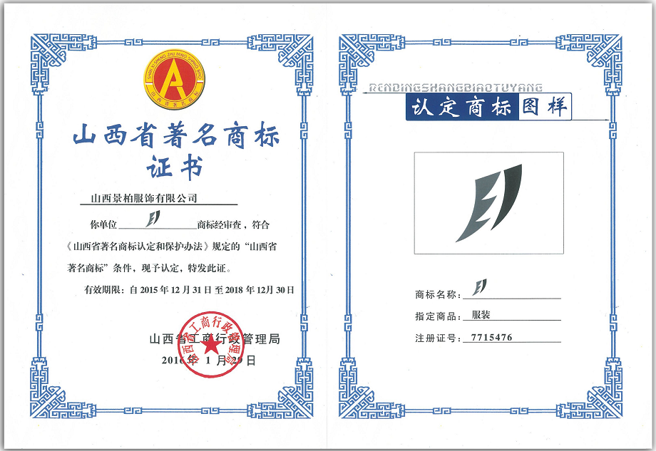 2011年,山西景柏服飾有限公司獲得全國(guó)工業(yè)產(chǎn)品生產(chǎn)許可證,成為山西省第二家獲得該資質(zhì)的企業(yè);此外,景柏服飾有限公司還獲得了防靜電A級(jí)、阻燃B級(jí)的資質(zhì),取得了新型礦工上衣、礦 工褲子、礦工腰帶、礦工靴四項(xiàng)國(guó)家專(zhuān)利。