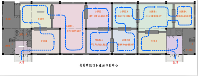這里是景柏職業(yè)裝體驗(yàn)中心的平面設(shè)計(jì)圖。從這里我們可以直觀的看到整個(gè)體驗(yàn)中心的全景。整個(gè)體驗(yàn)中心共包括十個(gè)大廳:企業(yè)形象廳、企業(yè)理念廳、工礦業(yè)功能性服裝廳、建筑能源廳、軍隊(duì)系統(tǒng)廳、消防廳、醫(yī)療衛(wèi)生職業(yè)裝服裝廳、辦公禮儀職業(yè)裝展示廳、文教系統(tǒng)功能性服裝廳以及企業(yè)未來廳。